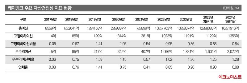 인터넷전문은행은 중·저신용자 대출을 주로 다루고 있기 때문에 시중은행 대비 건전성 관리에 불리할 수밖에 없다. 다만 케이뱅크의 건전성 지표가 경쟁사인 카카오뱅크와 비교해도 크게 취약한 것은 문제로 지적된다. 카카오뱅크의 경우 올해 3분기 말 기준 고정이하여신 잔액 규모는 1892억원으로 전체 여신 대비 0.44%에 그친다. 무수익여신은 이보다 적은 1874억원(0.44%)이다. 카카오뱅크의 연체율은 0.48%로 케이뱅크의 절반 수준이다.