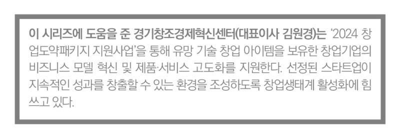 10회에 걸쳐 경기창조경제혁신센터의 ‘창업도약패키지 지원사업’을 통해 선정한 스타트업 창업가와 인터뷰를 진행한다. 창업도약패키지 지원사업은 ‘데스밸리’(죽음의 계곡)를 겪는 3~7년 사이의 스타트업을 지원한다. 이 사업에 선정된 스타트업 창업가의 생생한 이야기가 후배 창업가들의 성장에 도움을 줄 것이다.<편집자 주>