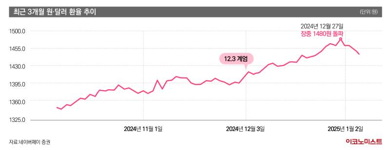 서울 외환시장에 따르면 지난해 12월 27일 원·달러 환율은 1480원을 돌파했다. 환율이 장중 1480원을 넘어선 것은 서브프라임 모기지 사태 당시인 2008년 11월 27일 이후 16년 만이다. 새해 들어 다소 안정세를 찾기는 했으나, 여전히 1450원대(1월 7일 종가 1454.5원)로 높은 수준을 유지하고 있다.