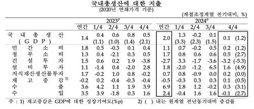 지난해 연간 GDP 성장률도 2.0%에 그쳤다. 지난해 4분기 성장률을 부문별로 보면, 민간소비는 의류·신발 등 준내구재와 의료·교육 등 서비스를 중심으로 0.2% 늘었다. 정부소비도 건강보험급여 등 사회보장 현물 수혜 위주로 0.5% 증가했고 설비투자 역시 반도체제조용장비 등 기계류의 호조로 1.6% 성장했다.