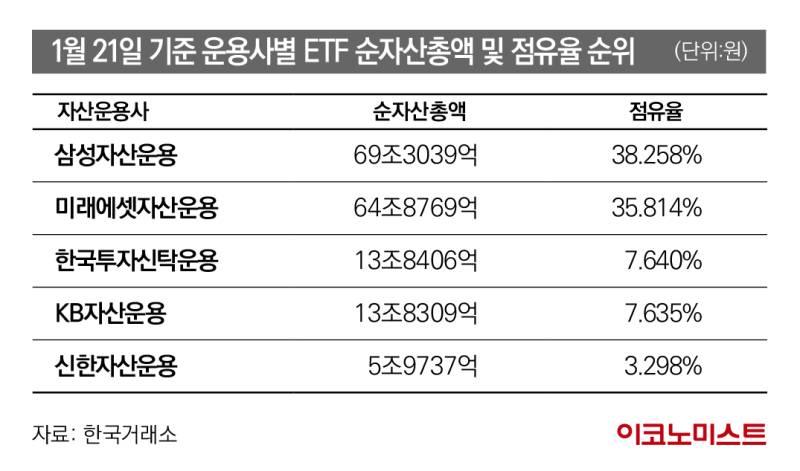 한국거래소에 따르면 1월 21일 기준 삼성자산운용의 ETF 순자산총액은 69조3039억원, 점유율은 38.26%를 기록했다. 업계 2위인 미래에셋자산운용의 점유율 35.81%(순자산 총액 64조8769억원)과는 3%포인트(p) 이내로 좁혀진 상황이다.