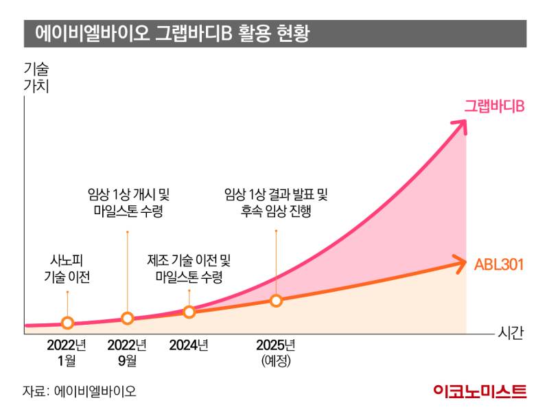 혈관-뇌 장벽 투과 기술을 보유한 기업은 세계적으로 많지 않다. 에이비엘바이오는 그중 하나다. 에이비엘바이오는 그랩바디B를 활용해 파킨슨병 치료제 후보물질 ABL301을 개발했다. 사노피에 10억6000만달러(약 1조4700억원) 규모로 기술 이전한 물질이 ABL301이다. ABL301은 연내 임상 1상이 끝나, 후속 임상에 들어갈 것으로 기대된다. ABL301의 임상 1상 결과는 에이비엘바이오가 그랩바디B를 적용한 물질 중 임상 결과를 공개하는 첫 사례다.
