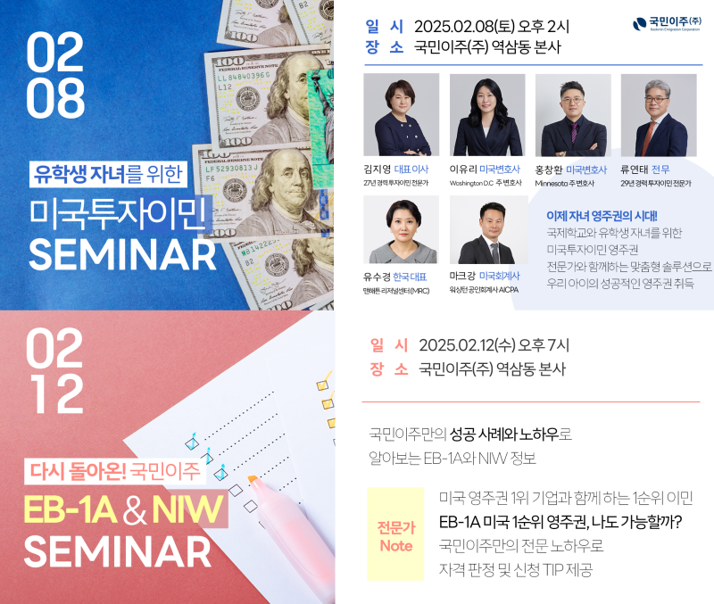 이러한 상황에 대응해 국민이주는 오는 2월 8일과 2월 12일에 걸쳐 두 차례의 미국 영주권 전략 세미나를 개최한다고 밝혔다. 서울 역삼동 본사에서 진행되는 이번 세미나는 각각 다른 영주권 프로그램을 주제로 삼아 EB-5 미국투자이민과 EB-1A 및 NIW를 심도 있게 다룬다.